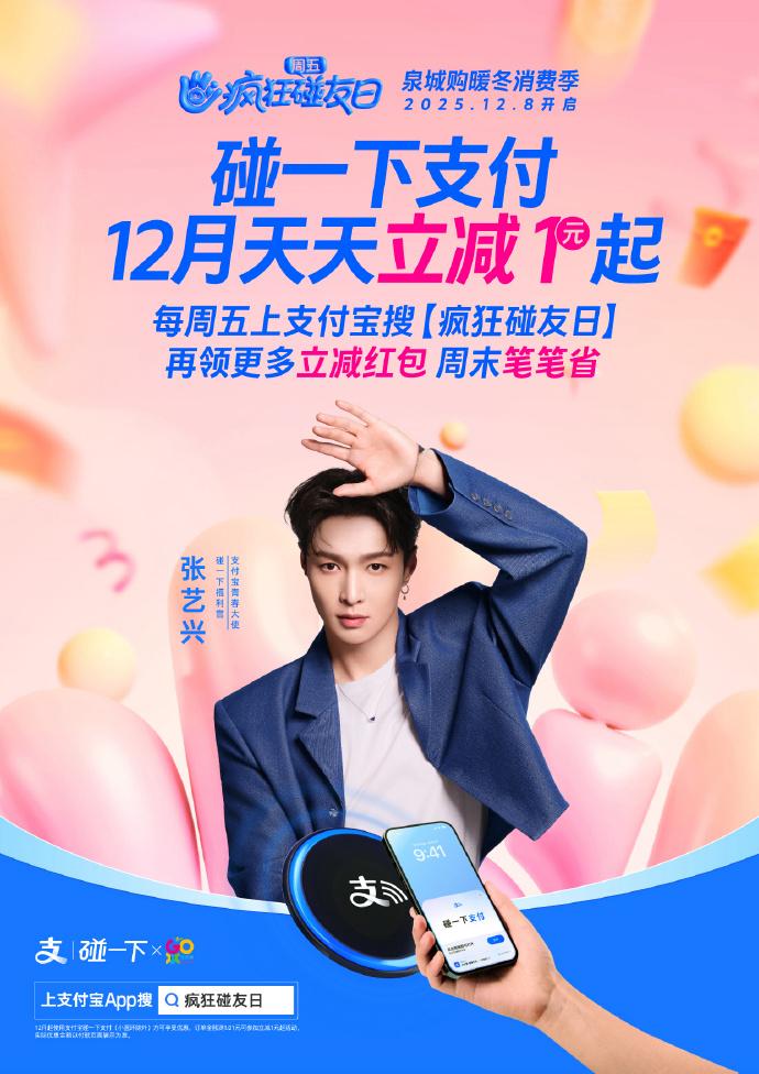 2、12月每周五,碰一下支付优惠更大,上支付宝App搜【疯狂碰友日】,更有百万份神券等你领。