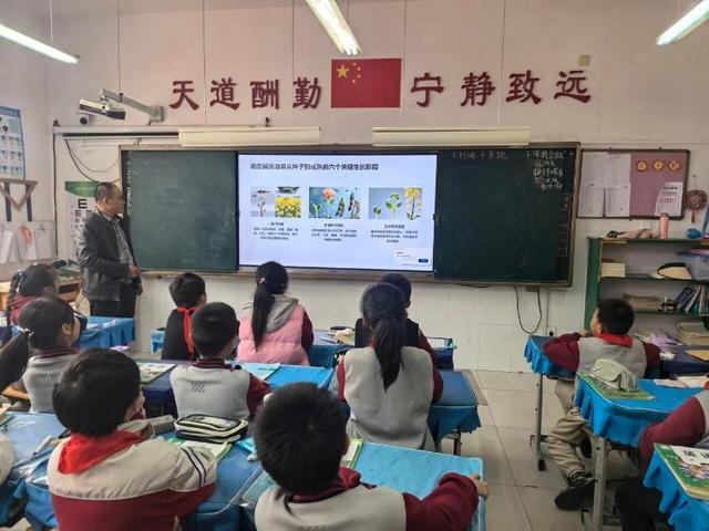 四年级化身“农物探秘小达人”,劳动老师带来油菜、莲藕、黄瓜等12种农作物的标本与课件,引导学生从根的形状,叶片边缘,果实形态等维度寻找识别要点,尤其重点讲解了油菜的十字花形与向阳生长的习性。