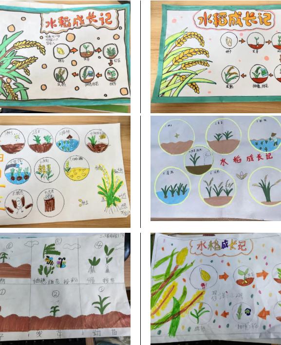 二年级的劳动老师现场讲解水稻、西红柿、土豆等作物的幼苗特征,重点强调水稻喜水的生长习性。带着课堂上学到的知识,孩子们周末自主尝试了解更多的水稻知识,还认真绘制作物生长过程图。